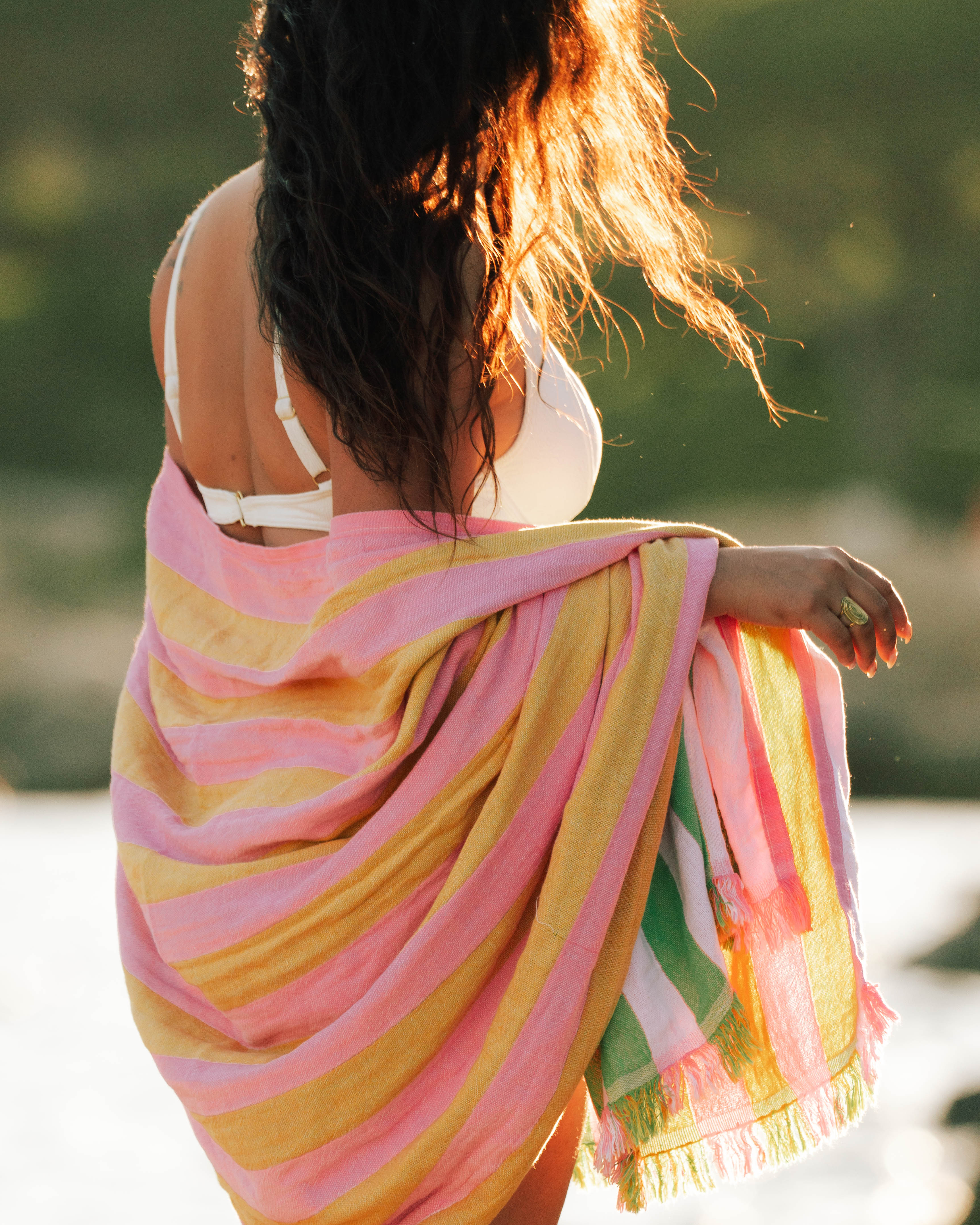 “Lightweight, absorbent, and beautifully woven, they’re perfect for beach days, picnics, or wrapping up after a summer swim.”